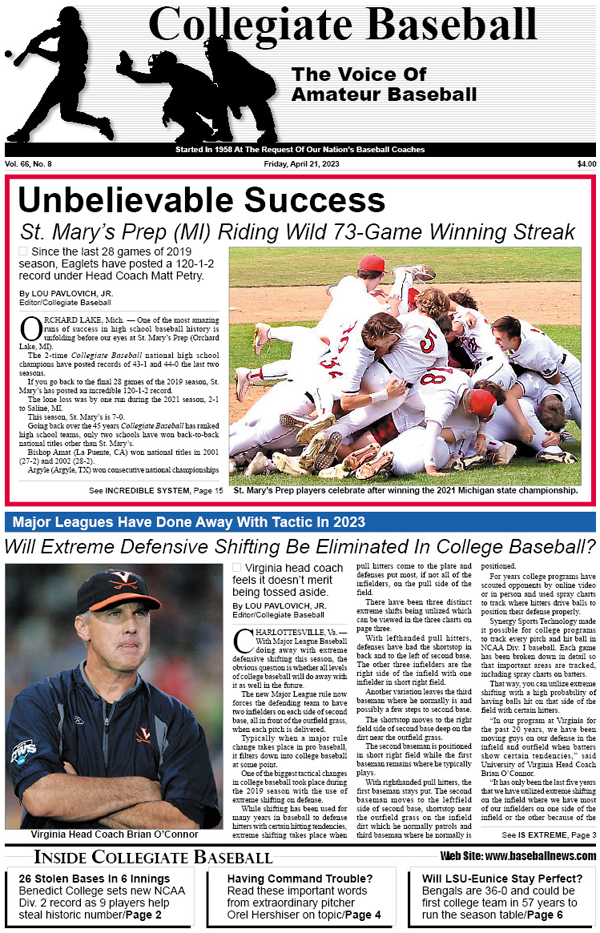 • Special Report: Read all about Coach Matt Petry’s amazing system that has allowed St. Mary’s Prep (MI) to win 73 straight games with only one loss in its last 123 contests as the Eaglets have won two straight Collegiate Baseball national high school championships in 2021 and 2022.
