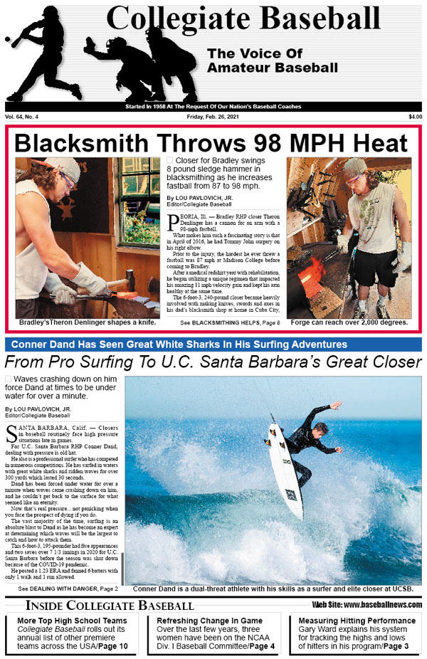• Blacksmith Throws 98 MPH Heat: Bradley’s Theron Denlinger swings 8-pound sledge hammer in blacksmithing as he increases fastball from 87 to 98 mph.