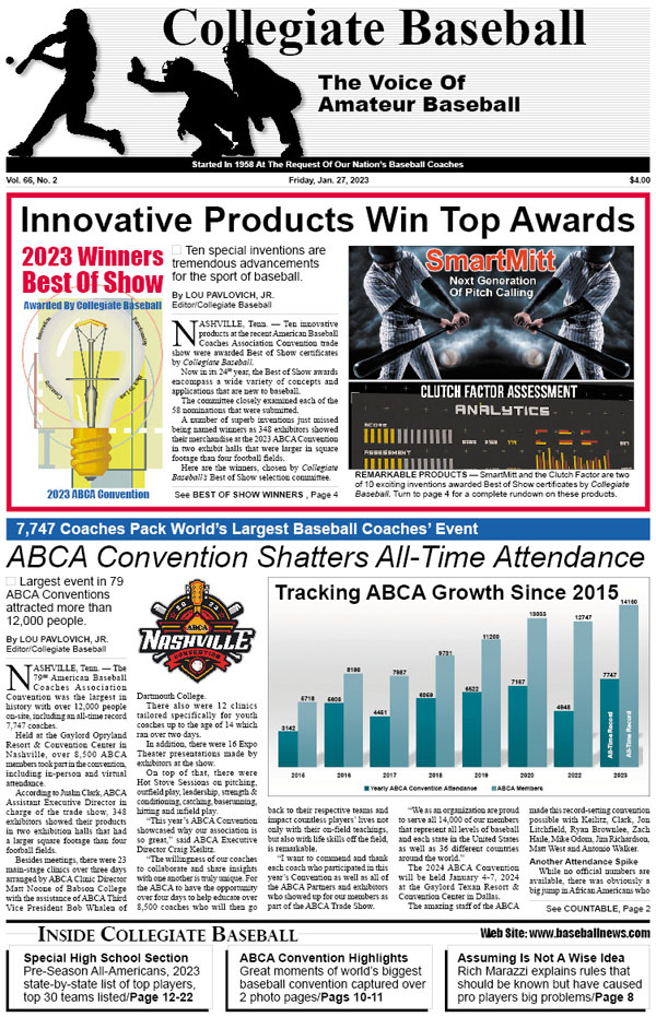 • ABCA Convention Shatters All-Time Attendance Record: More than 12,000 attend Nashville event which includes an all-time record 7,747 coaches. Plus, notes of ABCA Convention, all the awards and photos of speakers and special award winners are included.