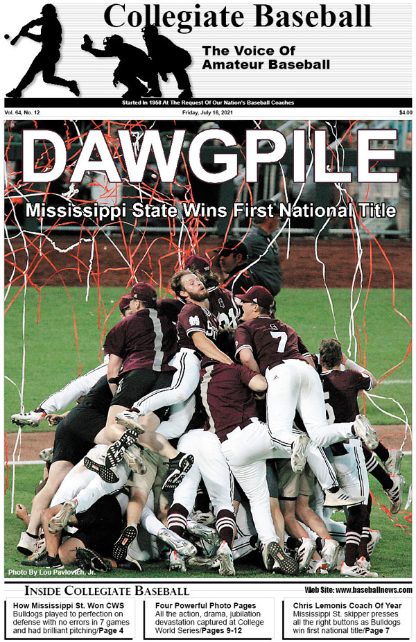 • CB’s Final NCAA Division I Poll Presented By Big League Chew: Mississippi St. No. 1 as Bulldogs win College World Series with no errors in 7 games over 238 chances.