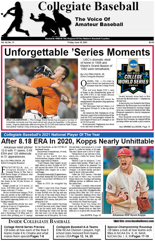 • Collegiate Baseball’s National Player of The Year: RHP Kevin Kopps posts 12-0 record, 11 saves, 0.68 ERA and 120 strikeouts in 31 appearances.