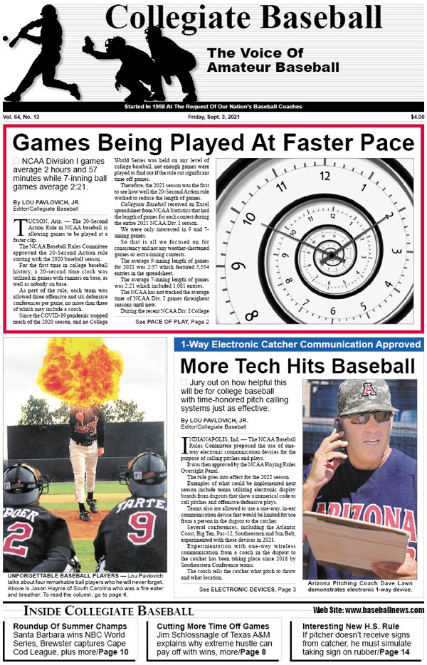 • Games Are Being Played At Faster Pace: NCAA Division I 9-inning games average 2 hours and 57 minutes during 2021 season. Vanderbilt’s Tim Corbin explains positives and negatives of 20-Second Action Rule.
