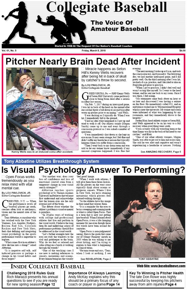 • Pitcher Nearly Brain Dead After Accident: Miracle happens as Seton Hill’s Kenny Wells recovers after being hit in back of skull by catcher’s throw to second.