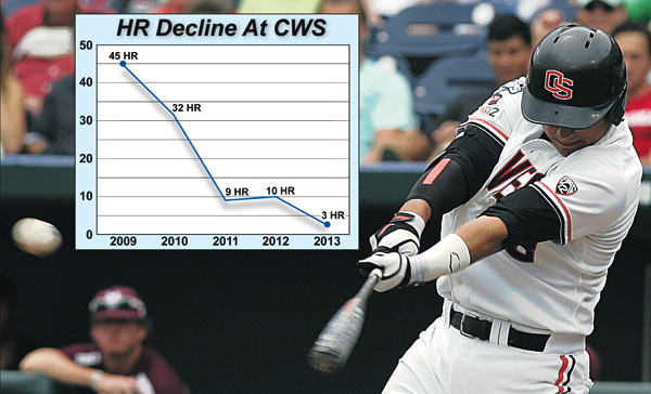 Also a factor has been T.D. Ameritrade Park in downtown Omaha which has been the venue for the CWS since 2011. The park faces southeast, and the outfield is a grave yard for hard hit fly balls that rarely carry over the fence.